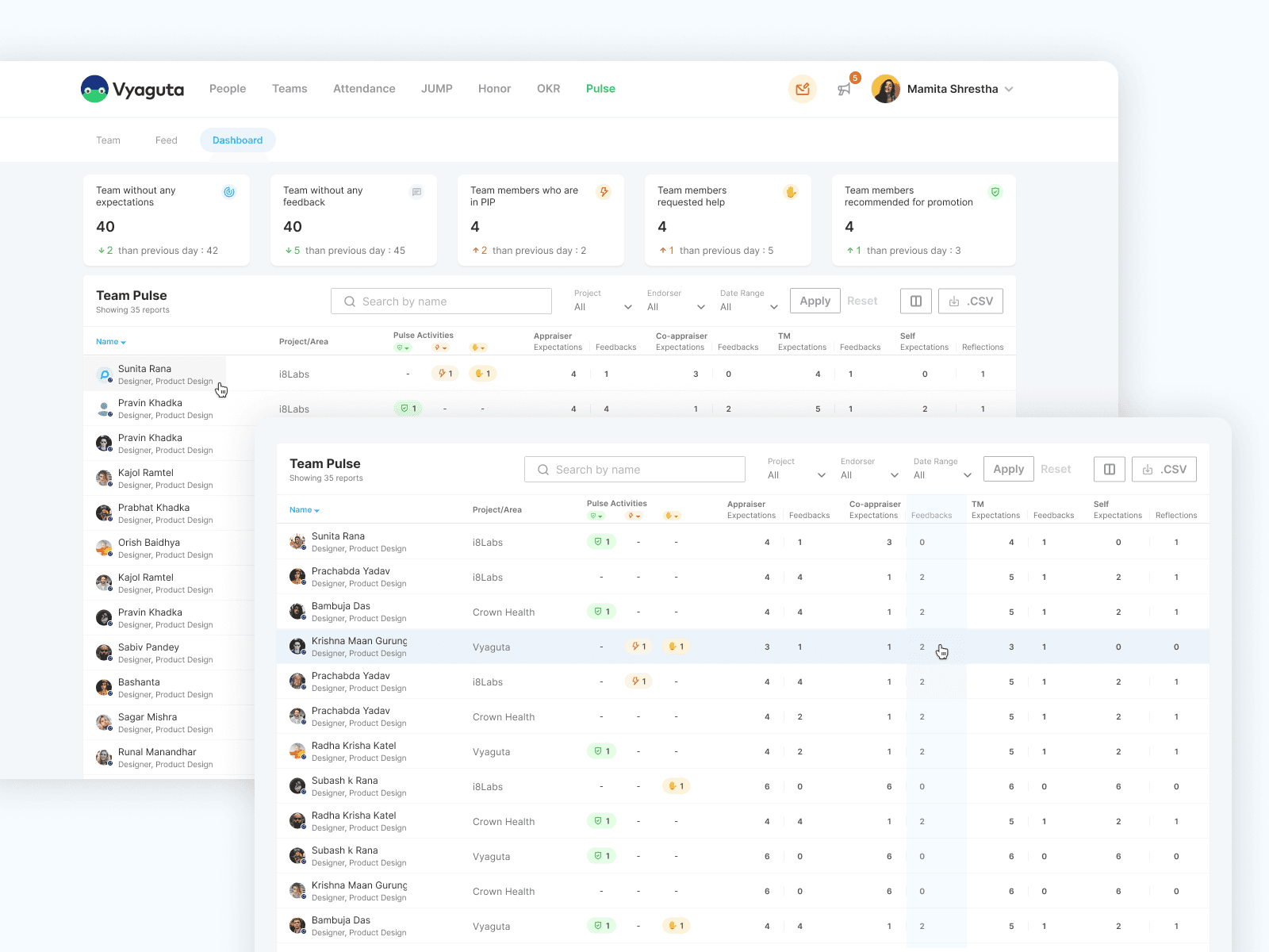 Team Pulse Dashboard: Real-time insights for managers on team health and performance trends with smart categorization and filtering